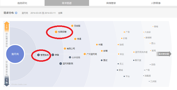 比如,你可以查看到,在2014-03-05至2014-03-11期间,作为最大的聚焦点“管理系统”关注度有所下降,但是第三大聚焦点“校园招聘”关注度正在上升。(如果你想对比一下不同品牌的校园招聘关注度,可以搜索下“校园招聘”的百度指数)