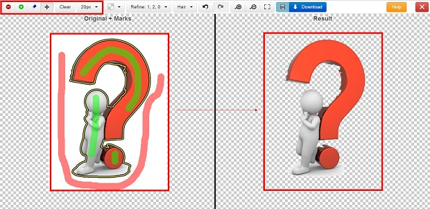 如下图,页面左边是原图,右面是抠图后的效果。在左上角是工具栏,工具栏上有红色和绿色两个笔刷,分别代表背景和前景的笔刷,绿色画笔涂抹的地方会保留下来,红色画笔涂抹的地方择会被抠掉,涂抹好之后,被删除与保留的边缘之间,会出现黄色的边界线。