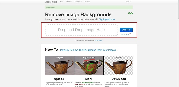 在浏览器地址栏输入「clippingmagic.com」,访问Clipping Magic网站 -> 将图片拖入虚线框中(见下图),或者选择「Choose File」上传图片。