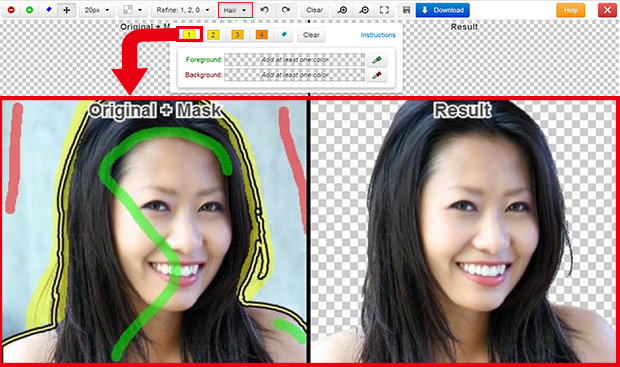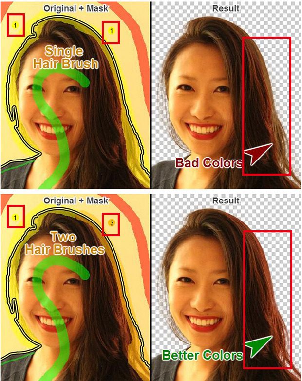 有时头发的左边和右边颜色不一样,所以需要保留/减去的颜色也不同,如果只用一个选区,可能会出现多减/少减的情况,这时就可以用「Hair」中有「1」「2」「3」「4」四个笔刷选项,标记不同的选区然后在吸取颜色。