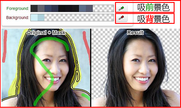 工具栏上有红色和绿色两个笔刷,分别代表背景和前景的笔刷,用绿色画笔涂抹在需要保留的地方,用红色画笔涂抹在的需要被抠掉的地方。 涂抹好之后,被删除与被保留的边缘之间,会出现黄色的边界线,请仔细调整直到头发的大部分轮廓都抠出来,只是有些细碎的毛发在外面。