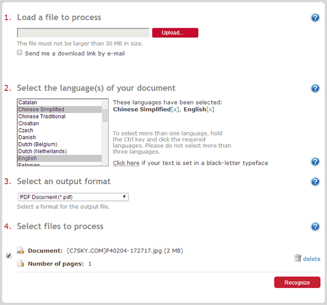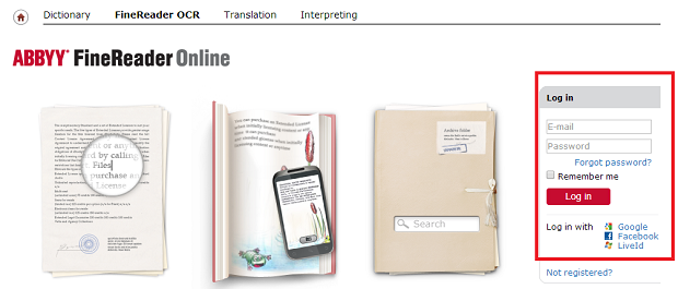 ABBYY FineReader Online 服务只对登录用户开放,所以你需要注册一个账号,注册账号是免费的,你也可以选择使用 Google/Facebook/LiveId 账号登陆。