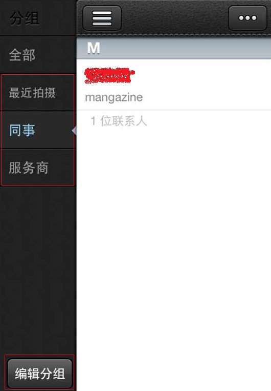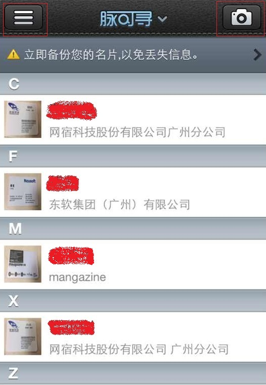 如下图,界面主要是一个联系人列表。列表左上方按钮是分组查看,右边是扫描名片。