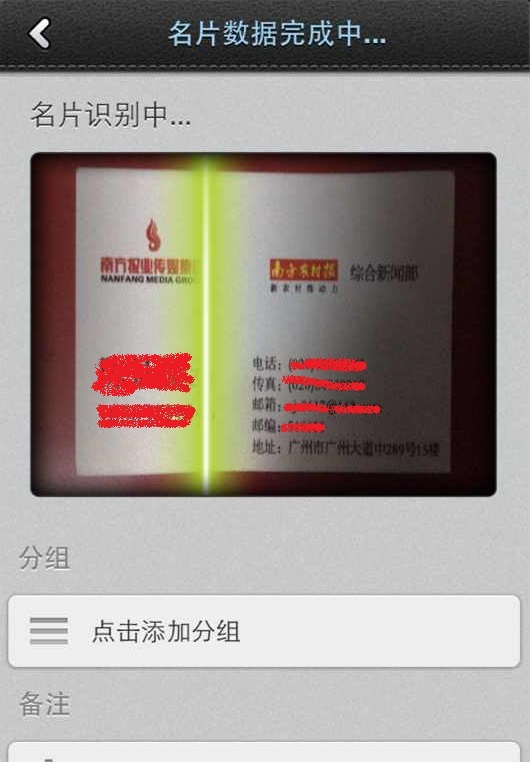 关闭扫描界面之后,点进正在识别的名片可以看到下面界面,此时正在识别名片。