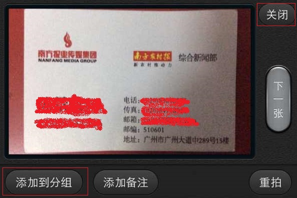 以小受哥的名片示例。打开扫描界面后,首先对着名片进行拍照;然后按添加分组按钮对名片进行归类;最后点击关闭按钮。