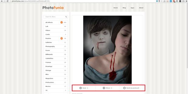 照片合成成功后,点击「Save」/「Share」/「Send as a postcard」就可以将这张图片保存或分享给你的朋友。