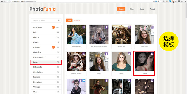 选择一个喜欢的模板。小玲在「Faces」分类中选了一个僵尸的模板。
