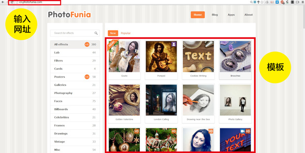 在浏览器地址栏输入「Photofunia.com」,进入网站后,可以在左侧的菜单栏中,有各种各样的主题场景模板可供选择,什么杂志、电视、庆典、书籍等等,无需注册便可免费使用。