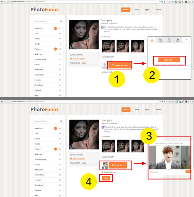 下面以把「长腿欧巴」变为吸血鬼为例:选择「Choose photo」->点击「Browse」上传照片 ->点击「Go」就可以直接合成图片了。