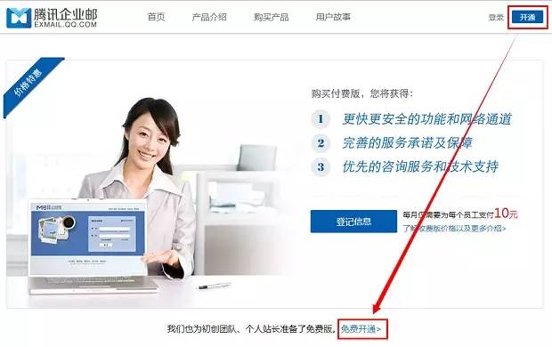访问www.exmail.qq.com -> 点击左上角的“开通” ->再点击页面下方中部的“免费开通”链接。