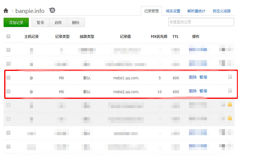 登陆你的域名管理界面中(banpie.info使用的是DNSPod),点击“添加记录”,填写如下MX记录,保存即可。