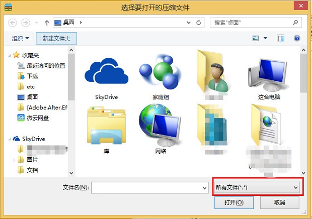 进入『选择要打开的压缩文件』-> 在『文件名』旁的『文件类型选择栏』中,选择『所有文件』-> 打开PPT所在的文件目录,打开后点击『解压』,将该PPT文档解压到电脑即可。