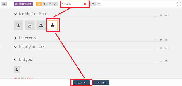 上期我们推荐了找Icon的thenounproject.com,这期我们来点新的:icomoon,网址:www.icomoon.io/app/,输入关键字Person,就可以找到对应的小Icon,点击「SVG」就可以直接下载了(记得在弹出的下载窗口中勾选「PNG」)。