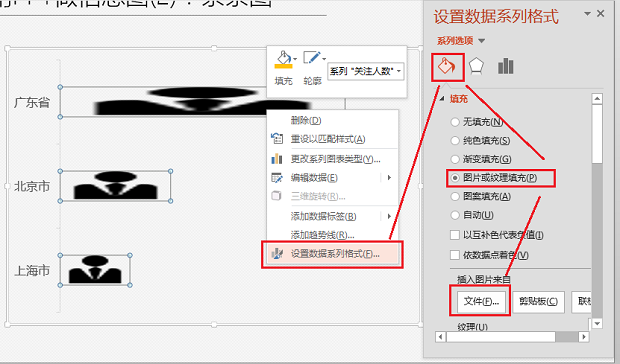 对着「条条图」的条条点击鼠标右键>在弹出的菜单中点击「设置数据系列格式」>在「填充」菜单中选择「图片或纹理填充」>点击「文件」插入你在第三步骤中下载的PNG图片。