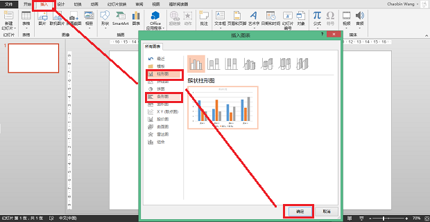打开PowerPoint,点击「插入」>选择「图表」按钮 > 在弹出的「插入图标」窗口中,选择「柱形图」/「条形图」> 点击「确定」。