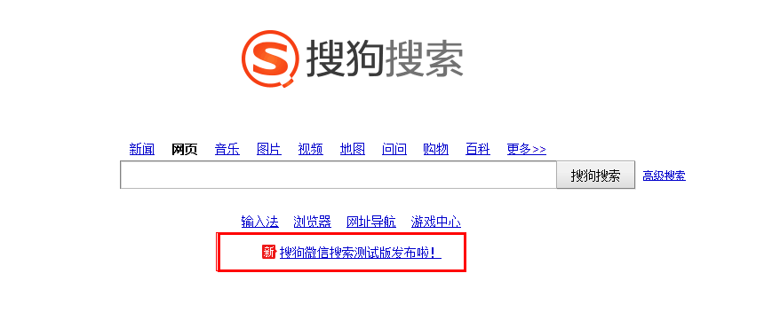 在浏览器中输入www.sogou.com 后,点击搜索栏地下的“搜狗微信搜索测试版发布啦!”超链接,进入微信搜索渠道。