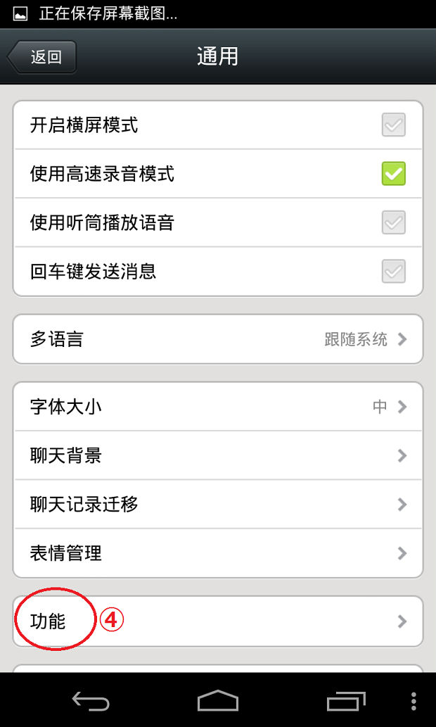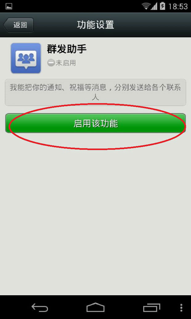 在弹出的设置对话框中,再依次打开「通用」–>「功能」–>「群发助手」按钮,准备开启群发助手功能。