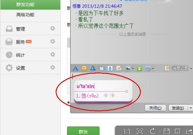 比如,跟死党聊天想找“怹”,郅原可以先打一个u,再打“ta”和“xin”,就这样“utaxin”,“怹”字就出来了,而且该字的旁边还有正确的注音“tan”。