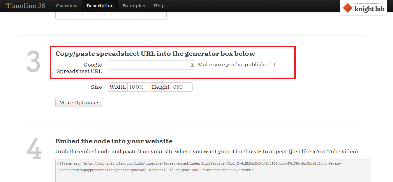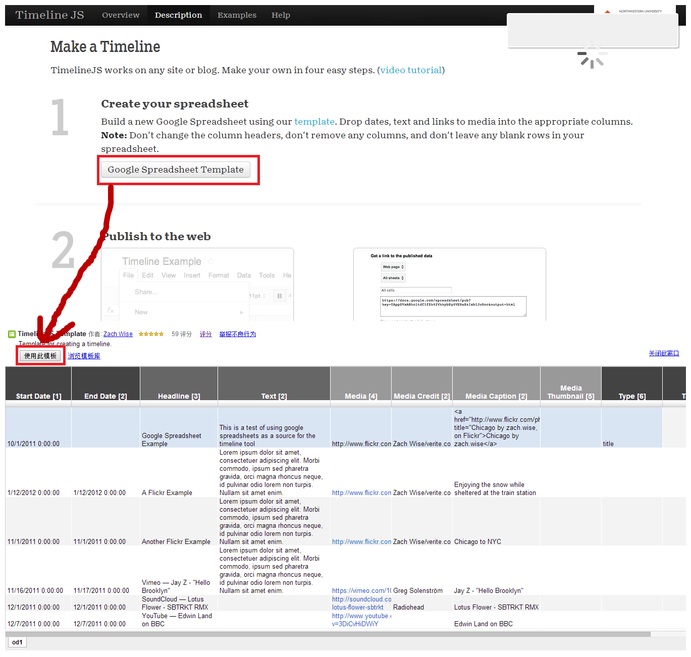 将在第三步复制的URL链接黏贴到“Google Spreadsheet URL”的输入栏中,然后点击下方的“Preview”即可查看创建的时间轴。