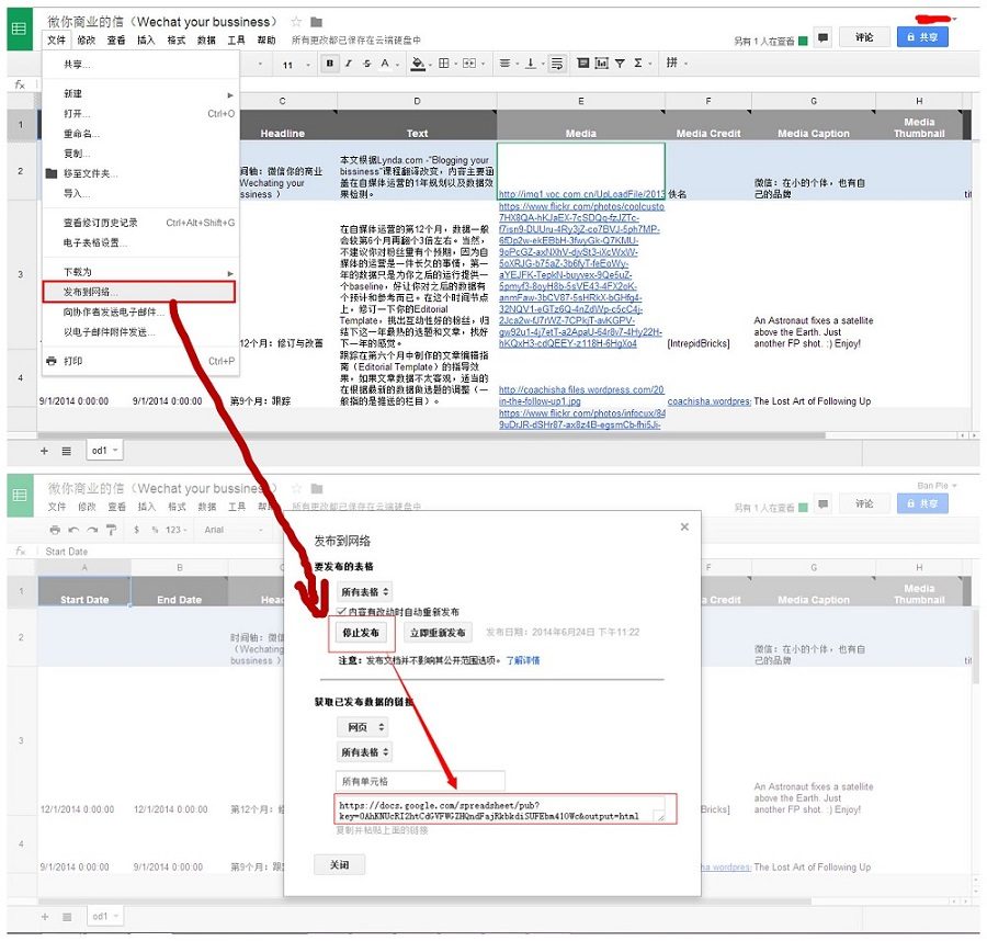 进入谷歌在线表格进行相应文字、标题、日期、图片地址等信息的修改,完成后点击左上角的“文件”菜单下的“发布到网络”按钮,在弹出的窗口中,点击“开始发布”,复制下方获得一个URL链接,以供下一步使用。