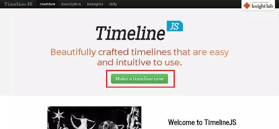 在浏览器中输入<www.timeline.knightlab.com>,跳转至 Timeline JS 的网站后,点击“Make a timeline now”开始创建时间轴。