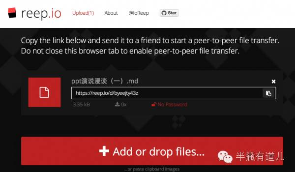 访问<www.reep.io> 之后,点击页面的[ Add or drop files ]选取要传送的文件,或直接将文档拖拽进去即可(多文档请事先进行压缩)。