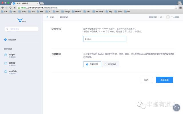 点击对象储存后,输入自定的空间名,设置为公开空间后,点击确认即可。