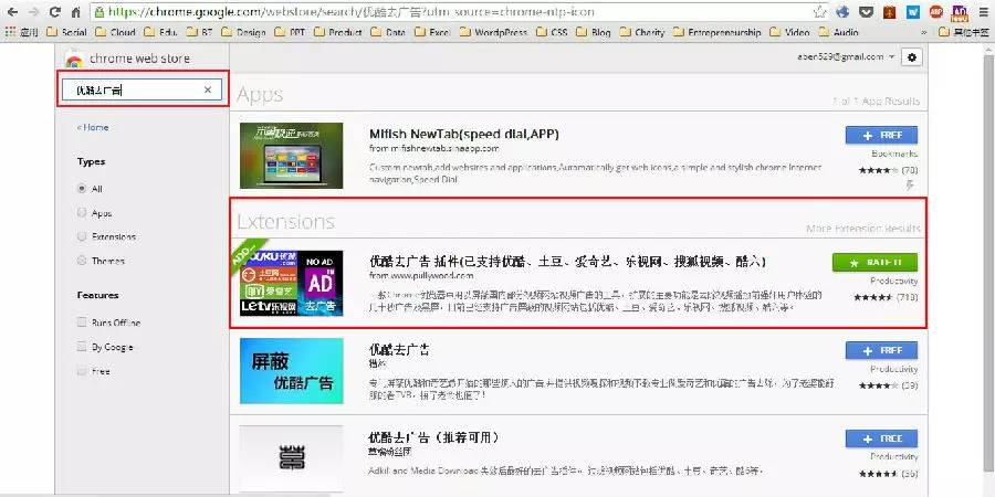 在浏览器的地址栏输入「chrome://apps/ 」或者访问谷歌应用商店网址 -> 跳转至 Chrome 应用商店后,在左侧的应用搜索栏输入「优酷去广告」,下载并安装对应的插件。
