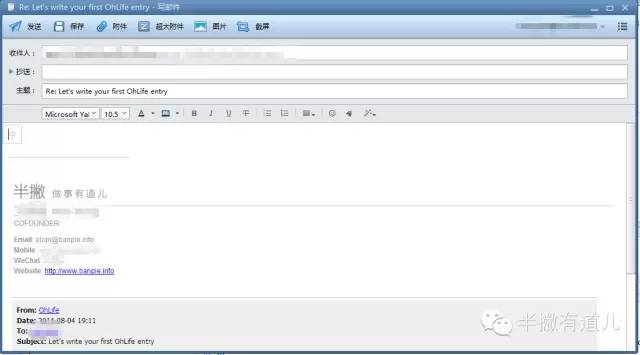 设置完密码之后,OhLife就会给你发送一份邮件,回复这份邮件,你的这封日记就会自动保存到网站上。(如果想从早上就开始记录,那么设置每天早上8点发送,这样当天多次回复邮件,就组成了一篇完整的日记)