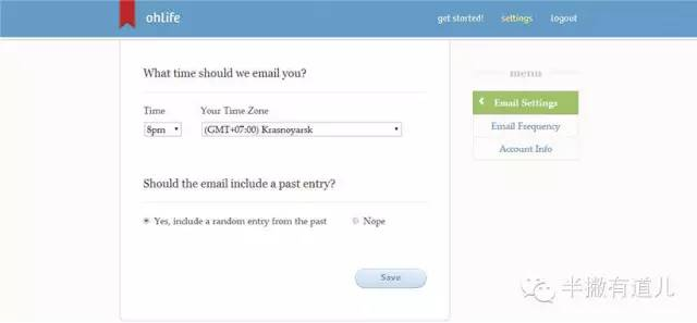 注册完OhLife之后,你可以点击右上角的“Setting”按钮,设置邮件发送的时间,频率,默认是每天晚上的8点。你还可以设置邮件内容是否包含昨天的日记,这样你可以稍微回顾下昨天发生了什么。