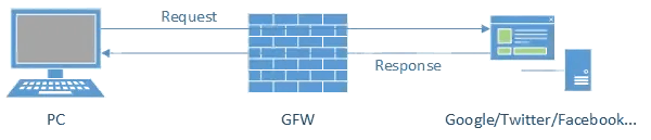 然后有一天,GFW 就出现了,他像一个收过路费的强盗一样夹在了在用户和服务之间,每当用户需要获取信息,都经过了 GFW,GFW将它不喜欢的内容统统过滤掉,于是客户当触发 GFW 的过滤规则的时候,就会收到Connection Reset这样的响应内容,而无法接收到正常的内容。