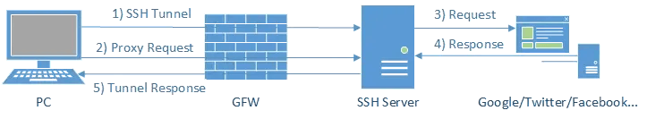 聪明的人们想到了利用境外服务器代理的方法来绕过 GFW 的过滤,其中包含了各种HTTP代理服务、Socks服务、VPN服务… 其中以 ssh tunnel 的方法比较有代表性。