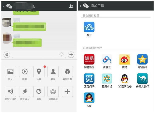 点击微信对话框的圆形「+」号按钮,在弹出的菜单中再点击圆角矩形「+」号按钮,选择添加微云/百度云后,即可直接在微信分享微云、百度云的文件。