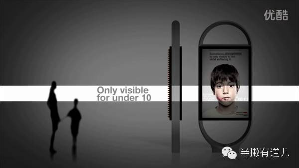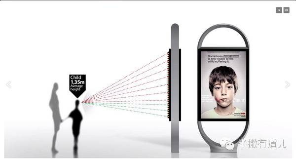 说到这里,最后西班牙慈善机构是怎么设计这个海报的呢?这一名为“A Message Only For Children”的公益海报中,设计者运用透镜印刷技术,让只有身高低于135公分的孩童(10岁的平均身高)才能看见求救专线号码,而成年人只能从海报上看到一个受惊男孩的头像。