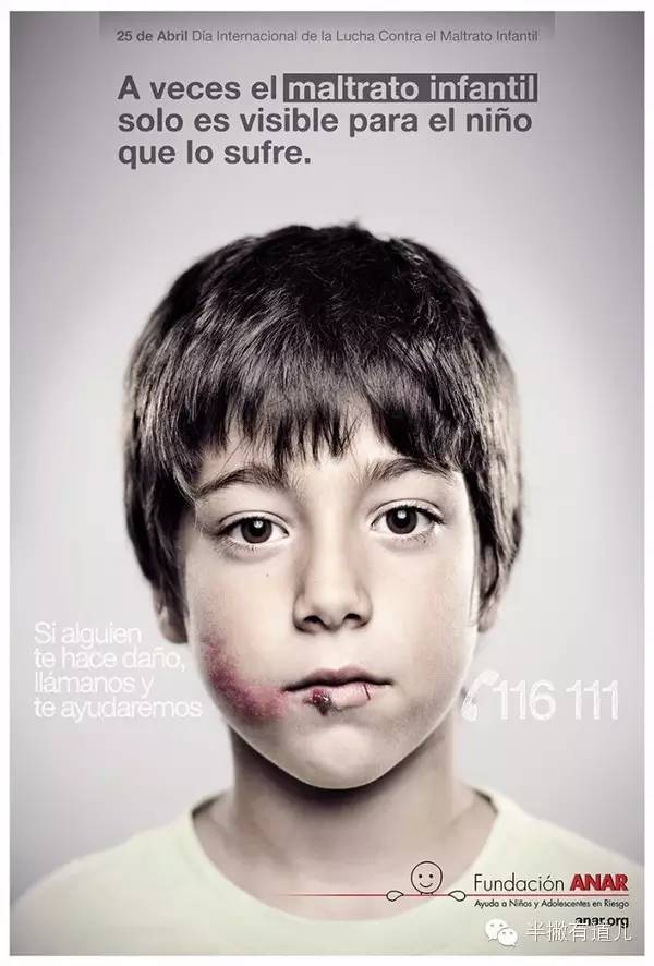 成人视角:一个普通的孩子图片,文字为“有时候,只有受虐的人最清楚”。