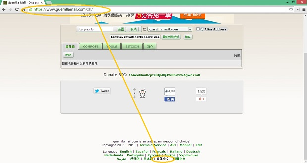 在浏览器的地址栏中输入https://www.guerrillamail.com访问Guerrilla Mail官网,你可以拉到页面下方,选择“中文”的语言界面。